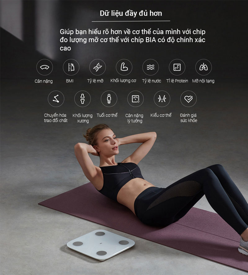 Cung cấp 13 chỉ số cơ thểCó phân tích thể chấtLưu trữ dữ liệu cho 16 người khác nhau trên ứng dụng Mi FitApp Mi Fit - Bluetooth 5.0